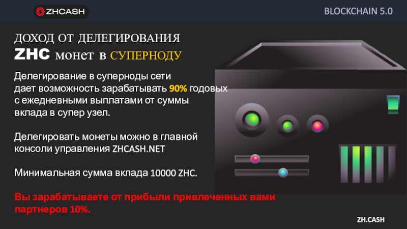 SUPERNODE (супер узел) - Собственный узел с быстрорастущей ликвидностью. Опорный узел сети ZHCASH с защищенным IPoS делегат пулом на который участники сети могут отправлять свои монеты под проценты. Владелец суперноды получает с комиссию с дохода делегаторов.
