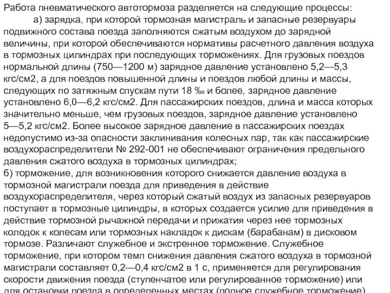 сцепления колеса с рельсом, которая с ростом скорости движения несколько снижается. Поэтому во фрикционных тормозах скоростных поездов целесообразно для достижения стабильной силы трения осуществлять изменение силы нажатия чугунных тормозных колодок в зависимости от скорости движения с помощью специальных регуляторов силы нажатия тормозных колодок либо применять только композиционные тормозные колодки, либо тормозные композиционные накладки в дисковом тормозе, коэффициент трения которых практически не изменяется с ростом скорости движения. Скоростными регуляторами силы нажатия чугунных тормозных колодок оборудованы пассажирские вагоны международного сообщения с тормозом KE-GPR и вагоны чешских железных дорог, оборудованные тормозом DAKO-R. В скоростных поездах все более широко применяются комбинированные системы торможения — дисковые тормоза с дисками на оси колесной пары с композиционными накладками и фрикционные тормоза с чугунными колодками, прижимаемыми к поверхности катания колес вагона. Дисковые тормоза позволяют избежать образования термических трещин на поверхности катания колеса. Однако при таких тормозах поверхность катания колес не очищается от грязи, масляных пленок, что приводит к ухудшению сцепления колес с рельсами, а следовательно, и к юзу (заклиниванию) колеса с образованием ползуна при высоких удельных тормозных силах. Поэтому для предотвращения юза колеса на скоростном подвижном составе применяются противогазные устройства. При действии противоюзного устройства длина тормозного пути несколько увеличивается.