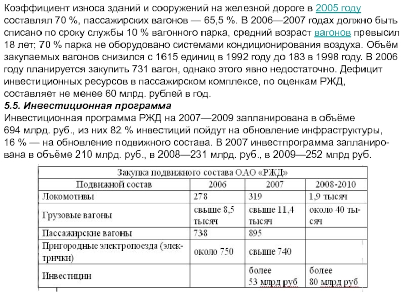 - ликвидация к 2010 г. дефицита пассажирских вагонов, исключение из эксплуатации вагонов с просроченным сроком службы;
