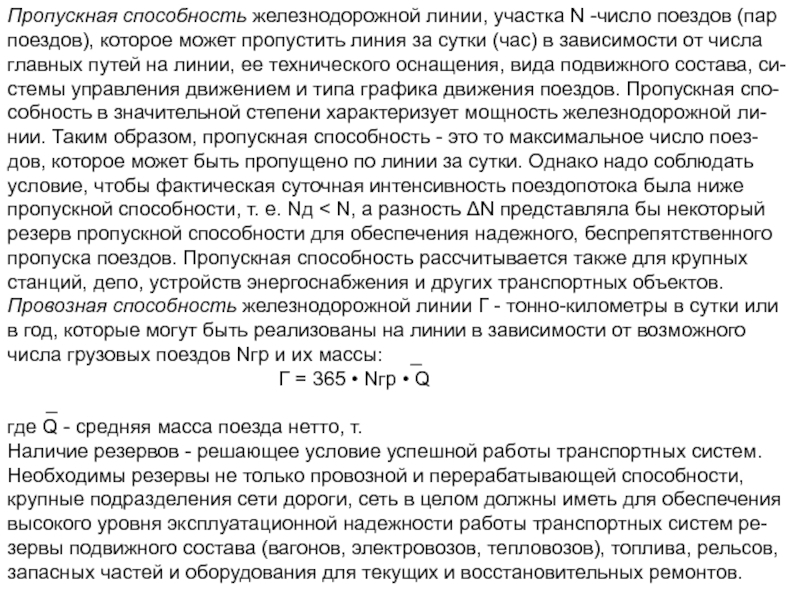 числа главных путей на линии, ее технического оснащения, вида подвижного состава, си-стемы управления движением и типа графика движения поездов. Пропускная спо-собность в значительной степени характеризует мощность железнодорожной ли-нии. Таким образом, пропускная способность - это то максимальное число поез-дов, которое может быть пропущено по линии за сутки. Однако надо соблюдать условие, чтобы фактическая суточная интенсивность поездопотока была ниже пропускной способности, т. е. Nд < N, а разность N представляла бы некоторый резерв пропускной способности для обеспечения надежного, беспрепятственного пропуска поездов. Пропускная способность рассчитывается также для крупных станций, депо, устройств энергоснабжения и других транспортных объектов.