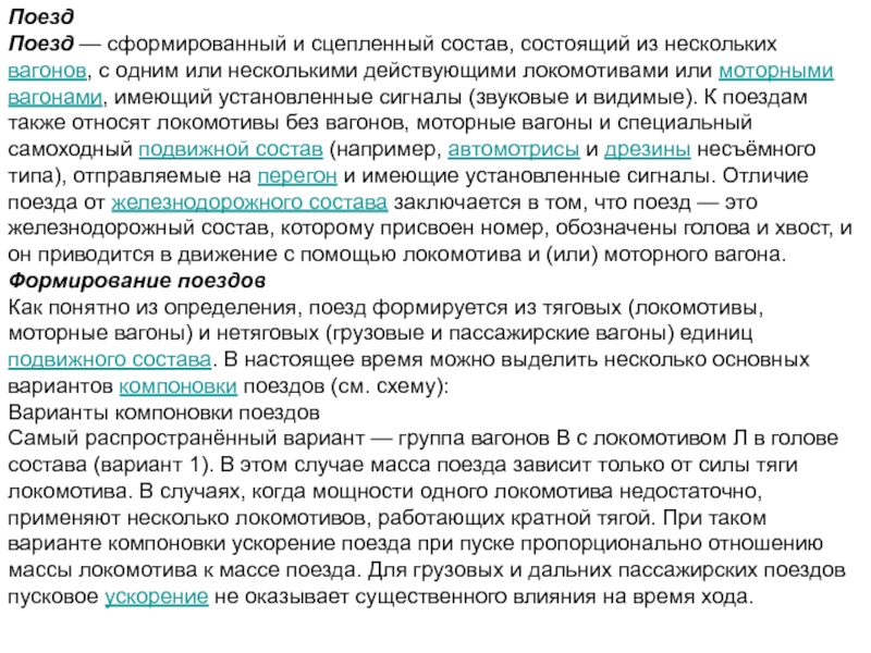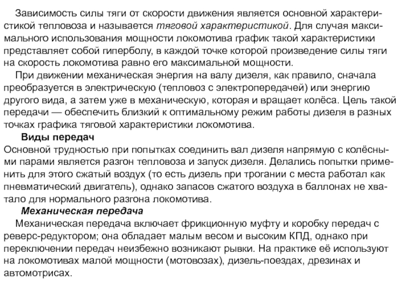 занимает ведущее место. На его долю приходится 58% всех перевозок. Это объясняется его универсальностью - возможностью обслуживать производящие отрасли хозяйства и удовлетворять потребности населения в перевозках в независимости от погодных условий практически во всех климатических условиях и в любое время года. Современный железнодорожный транспорт базируется: во-первых, на современных видах тяги, мощных тепловозах и электровозах; во-вторых, надёжных перевозочных ёмкостях для перевозки, насыпных жидких, сжиженных и штучных грузов и современных цельнометаллических пассажирских вагонах; в-третьих, мощном рельсовом осно-вании, позволяющем перевозить большие грузопотоки на больших скоростях, в-четвертых, на прогрессивных средствах компьютеризации и автоматической сигнализации.