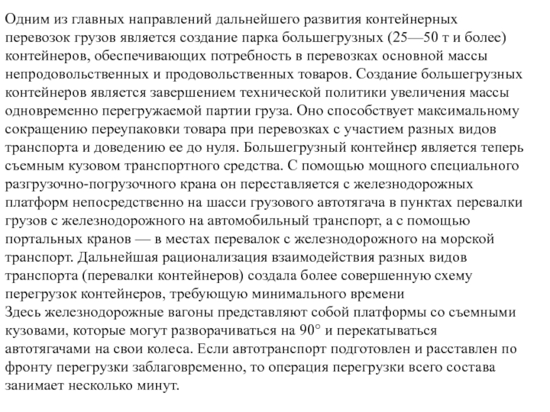 в перевозках основной массы непродовольственных и продовольственных товаров. Создание большегрузных контейнеров является завершением технической политики увеличения массы одновременно перегружаемой партии груза. Оно способствует максимальному сокращению переупаковки товара при перевозках с участием разных видов транспорта и доведению ее до нуля. Большегрузный контейнер является теперь съемным кузовом транспортного средства. С помощью мощного специального разгрузочно-погрузочного крана он переставляется с железнодорожных платформ непосредственно на шасси грузового автотягача в пунктах перевалки грузов с железнодорожного на автомобильный транспорт, а с помощью портальных кранов — в местах перевалок с железнодорожного на морской транспорт. Дальнейшая рационализация взаимодействия разных видов транспорта (перевалки контейнеров) создала более совершенную схему перегрузок контейнеров, требующую минимального времени