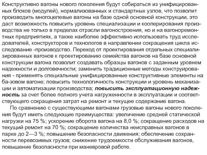 По сравнению с существующими вагонами грузовые вагоны нового поколе-ния будут иметь следующие преимущества: увеличение средней статической нагрузки на 75 %; ускорение оборота вагона на 8,0 %; сокращение расходов на текущий ремонт на 70 %; сокращение количества неисправных вагонов в парке до 2—3 %; повышение безопасности движения; обеспечение сохран-ности перевозимых грузов; снижение трудоемкости обслуживания вагонов, повышение безопасности при маневровой работе.