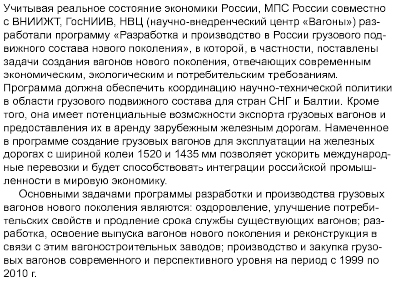 в России грузового под-вижного состава нового поколения», в которой, в частности, поставлены задачи создания вагонов нового поколения, отвечающих современным экономическим, экологическим и потребительским требованиям. Программа должна обеспечить координацию научно-технической политики в области грузового подвижного состава для стран СНГ и Балтии. Кроме того, она имеет потенциальные возможности экспорта грузовых вагонов и предоставления их в аренду зарубежным железным дорогам. Намеченное в программе создание грузовых вагонов для эксплуатации на железных дорогах с шириной колеи 1520 и 1435 мм позволяет ускорить международ-ные перевозки и будет способствовать интеграции российской промыш-ленности в мировую экономику.