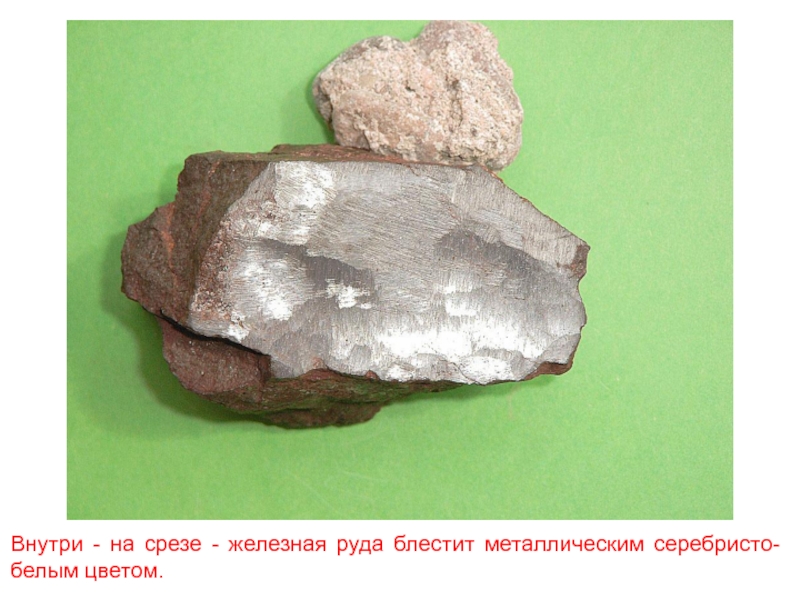 Слайд 9Внутри - на срезе - железная руда блестит металлическим серебристо-белым