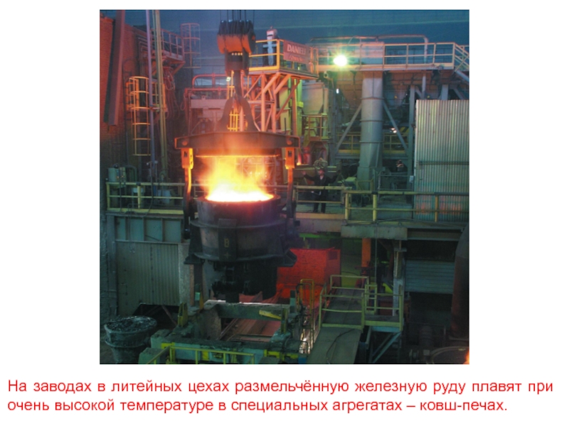 Слайд 12На заводах в литейных цехах размельчённую железную руду плавят при