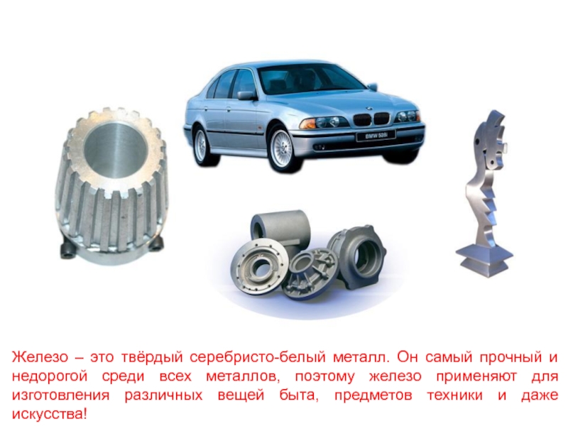 Железо – это твёрдый серебристо-белый металл. Он самый прочный и недорогой среди всех металлов, поэтому железо применяют для изготовления различных вещей быта, предметов техники и даже искусства!