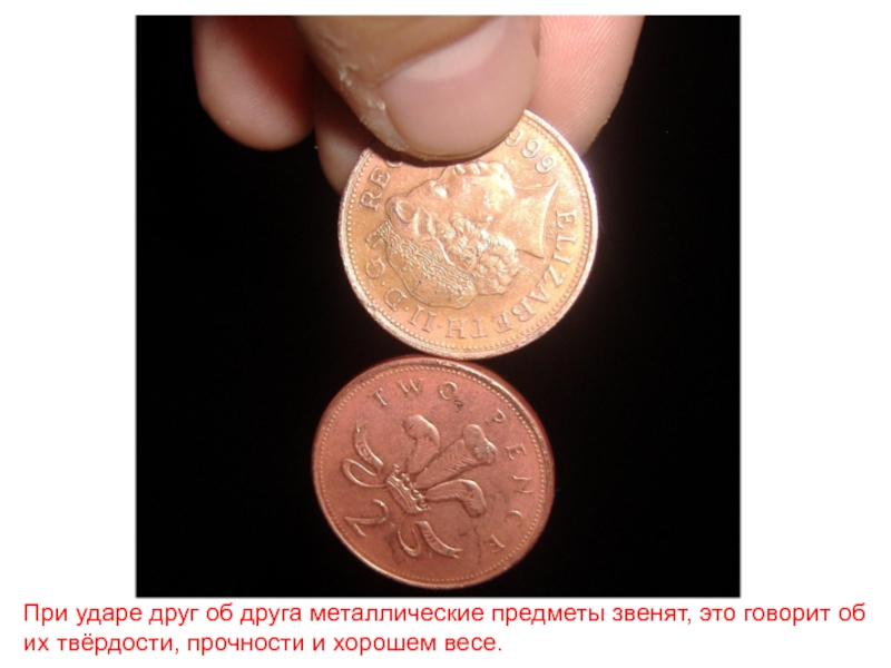 Слайд 23При ударе друг об друга металлические предметы звенят, это говорит