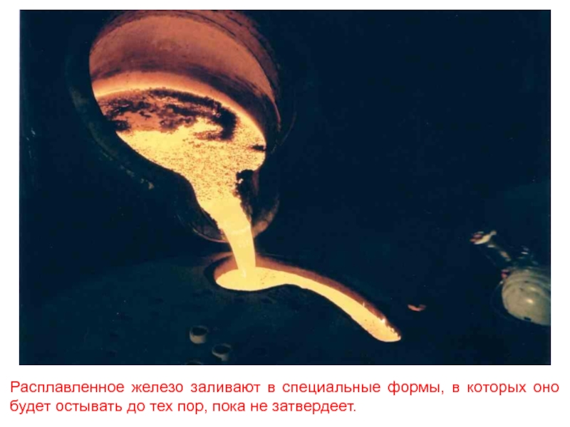 Слайд 13Расплавленное железо заливают в специальные формы, в которых оно будет