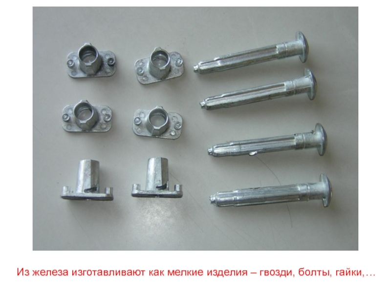 Слайд 18Из железа изготавливают как мелкие изделия – гвозди, болты, гайки,…