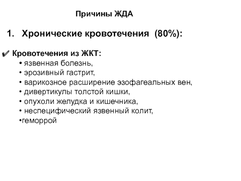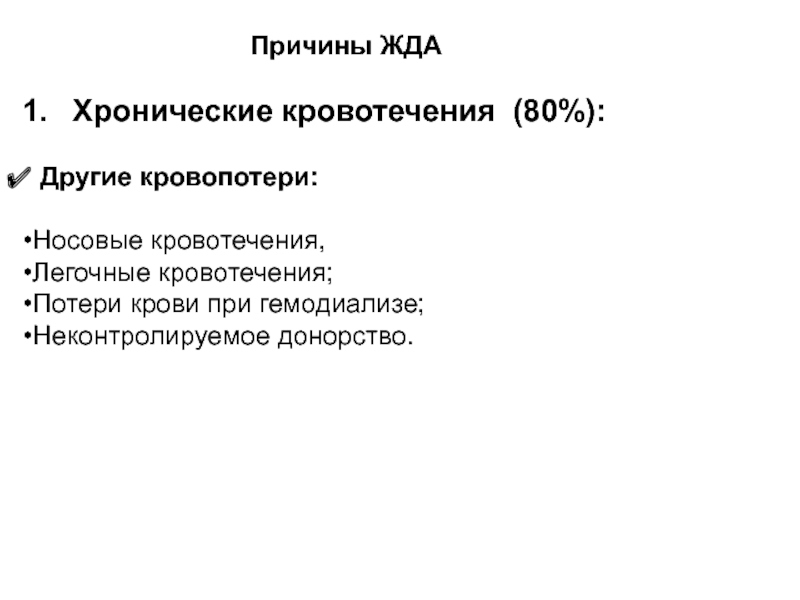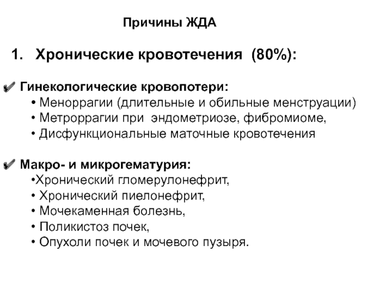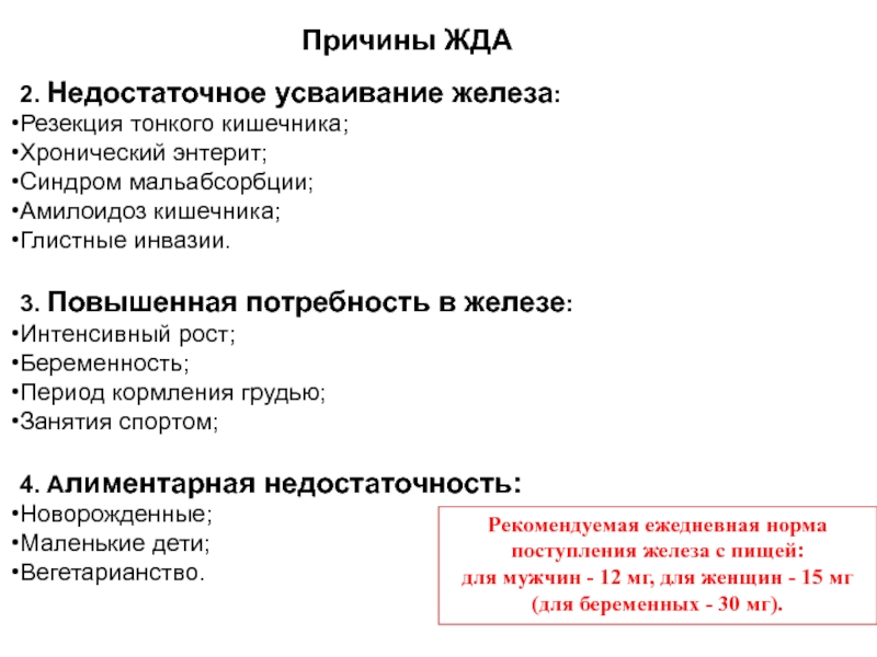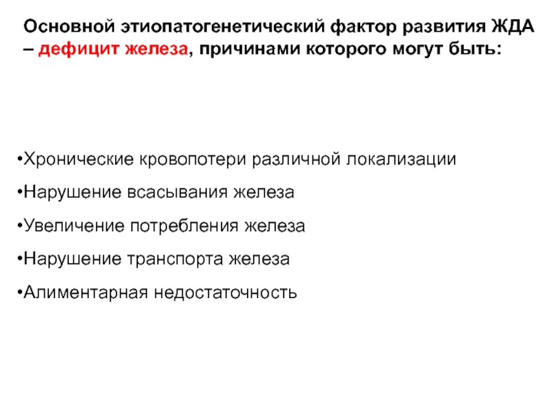 Основной этиопатогенетический фактор развития ЖДА – дефицит железа, причинами