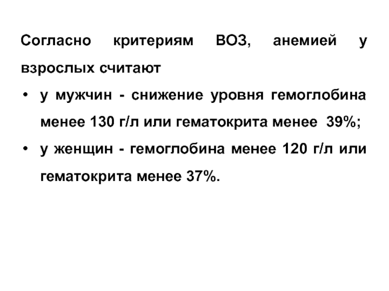 Слайд 5Согласно критериям ВОЗ, анемией у взрослых считают