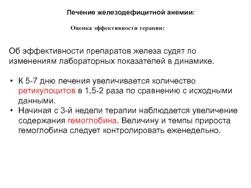 Слайд 50Об эффективности препаратов железа судят по изменениям лабораторных показателей в