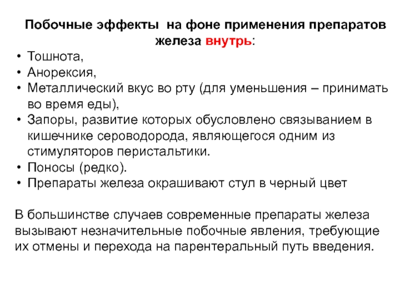 В большинстве случаев современные препараты железа вызывают незначительные побочные явления, требующие их отмены и перехода на парентеральный путь введения.