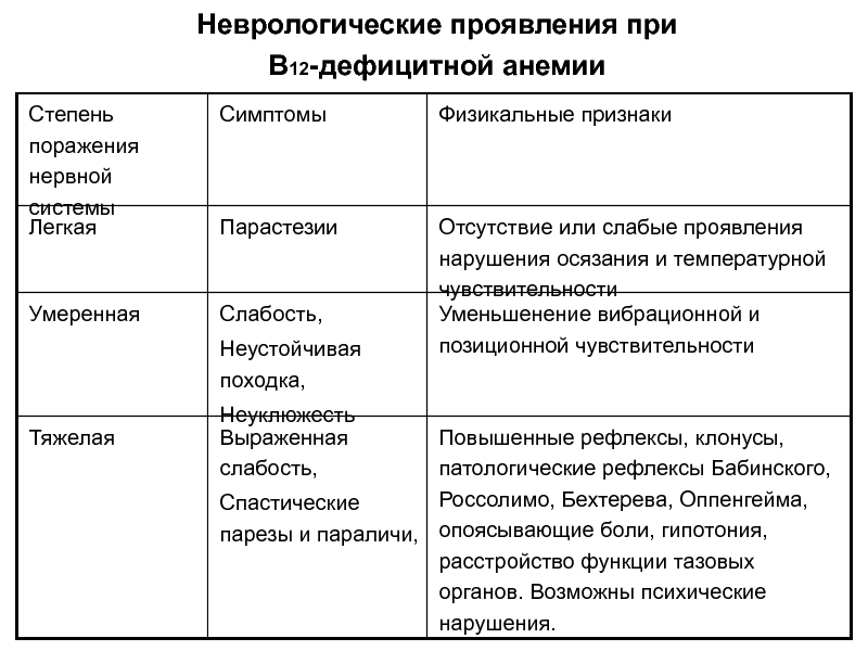 Симптомы анемии и поражения нервной системы (фуникулярный