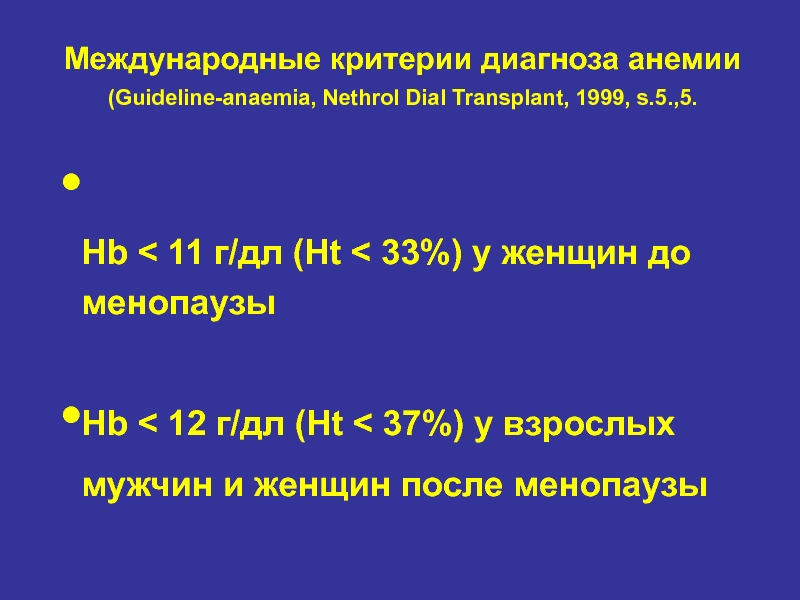 Слайд 4Международные критерии диагноза анемии (Guideline-anaemia, Nethrol Dial Transplant, 1999, s.5.,5.