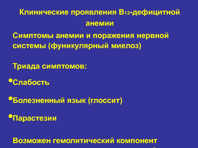 Слайд 80Клинические проявления B12-дефицитной анемии
