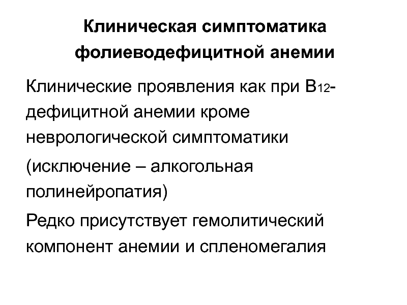 Слайд 88Клиническая симптоматика фолиеводефицитной анемии