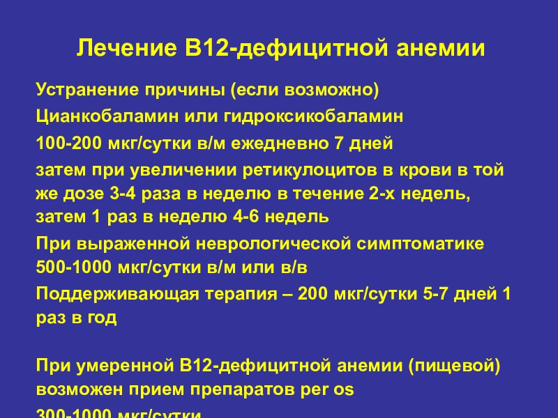 При умеренной B12-дефицитной анемии (пищевой) возможен прием препаратов per os