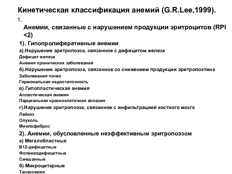 Слайд 9Кинетическая классификация анемий (G.R.Lee,1999).