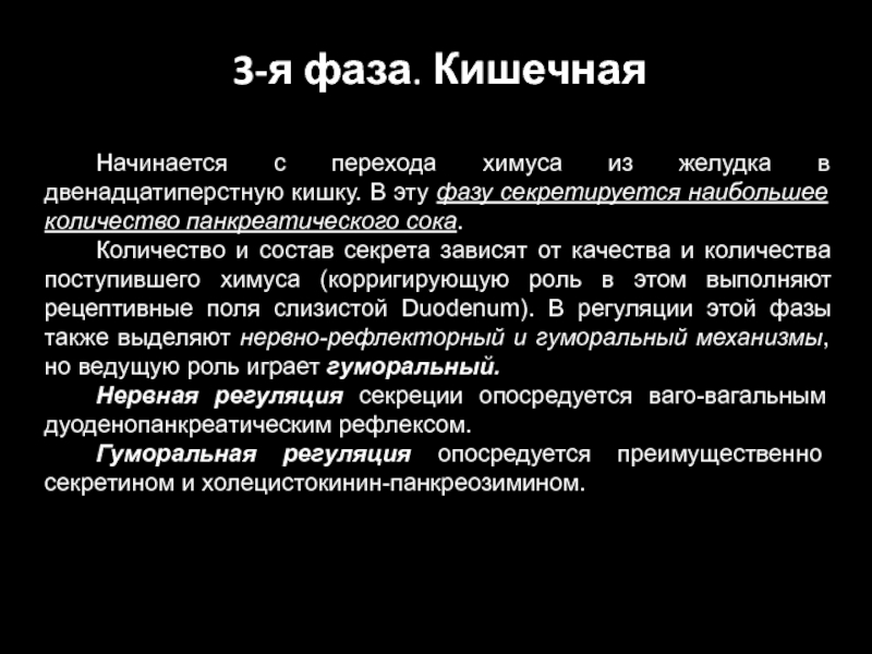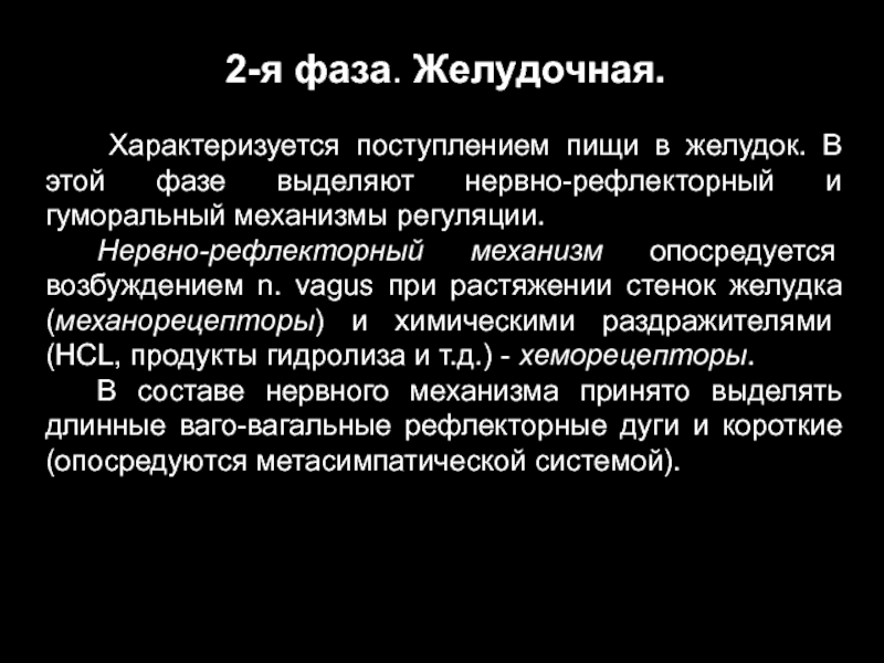 Во вторую фазу осуществляются в основном корригирующие влияния на желудочные железы. Таким образом, обеспечивается соответствие секреции – количеству и свойствам пищи.