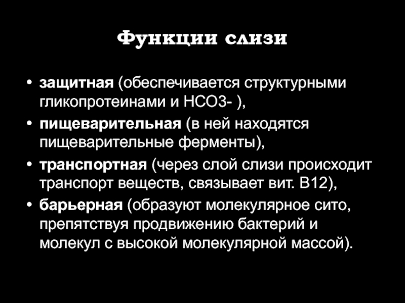 она образует мукозо-бикарбонатный барьер - коллоидную мембрану, толщиной 1,0 – 1,5 мм (защитный барьер Холлендера), предохраняя слизистую от аутолиза под воздействием HCL и пепсинов.