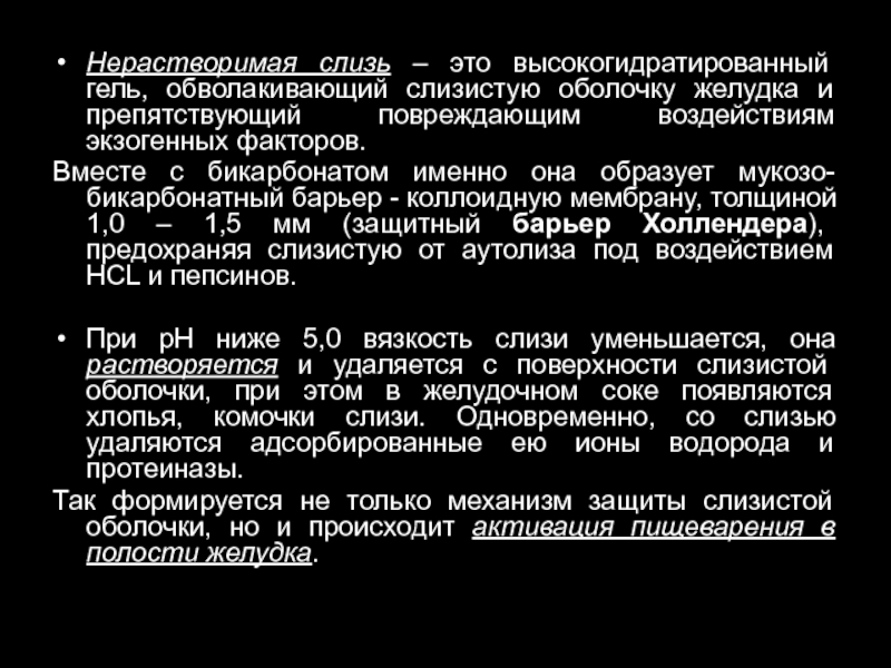 Слайд 2Нерастворимая слизь – это высокогидратированный гель, обволакивающий слизистую оболочку желудка