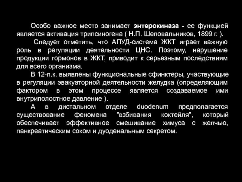 Показано, что вырабатываемые под влиянием химуса в duodenum секретин и ХЦК-ПЗ усиливают секрецию пепсиногена, но тормозят образование HCL.