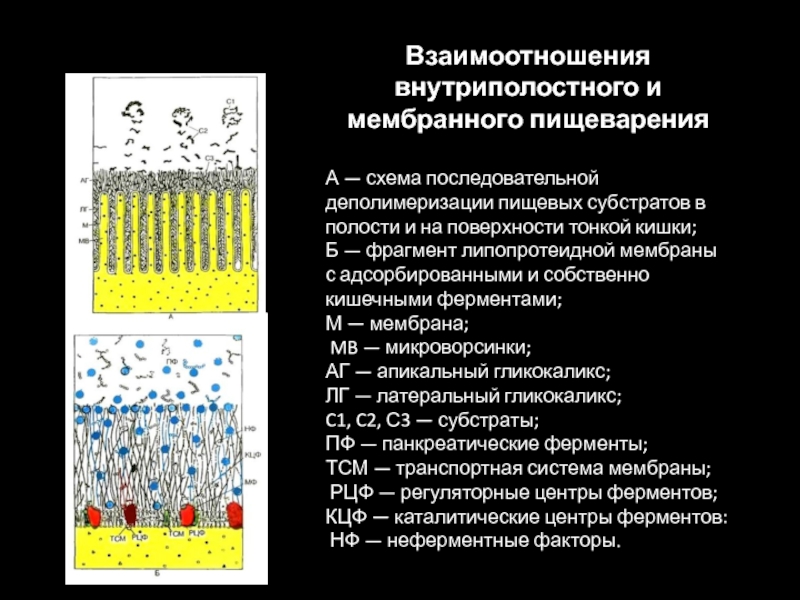 Слайд 104Взаимоотношения внутриполостного и мембранного пищеварения