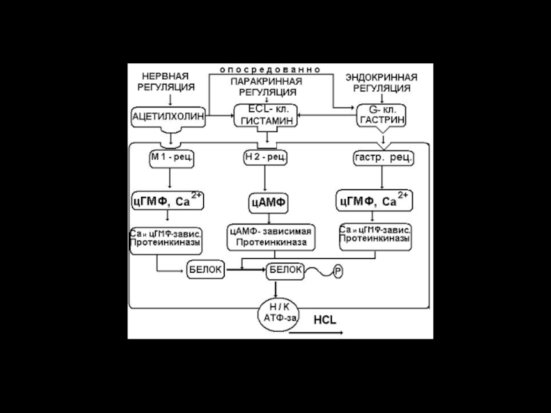Самым мощным стимулятором продукции HCL является гистамин (продуцируется ECL-кл. фундального отдела). Он оказывает локальное паракринное действие на обкладочные клетки (в меньшей степени на главные клетки), взаимодействуя с Н2 – рецепторами. Продукция гистамина повышается под влиянием n. vagus и гастрина.