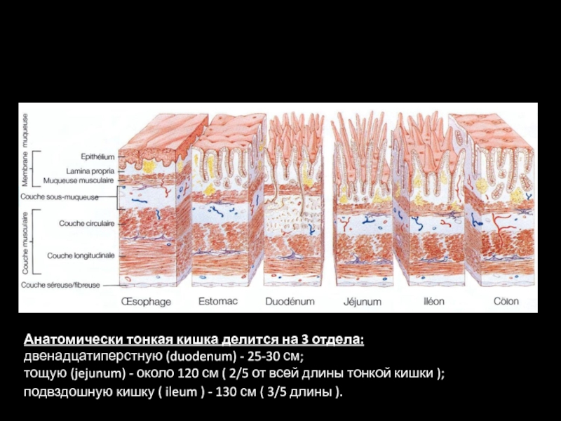 Слайд 96Анатомически тонкая кишка делится на 3 отдела: