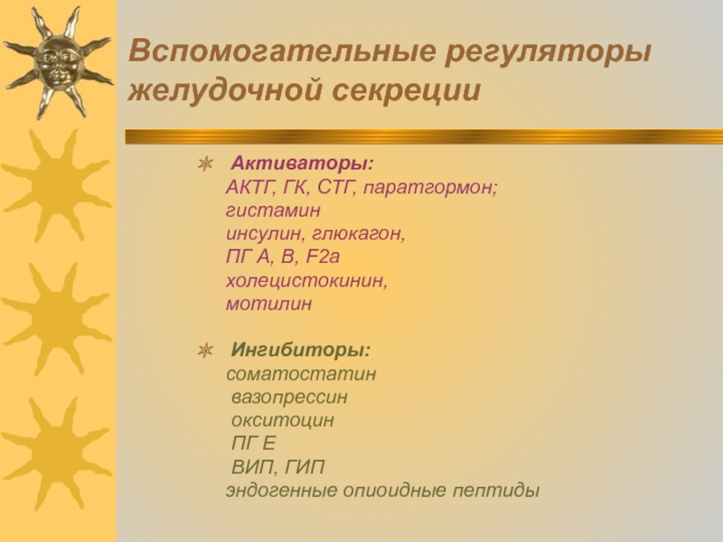 Слайд 15Вспомогательные регуляторы желудочной секреции