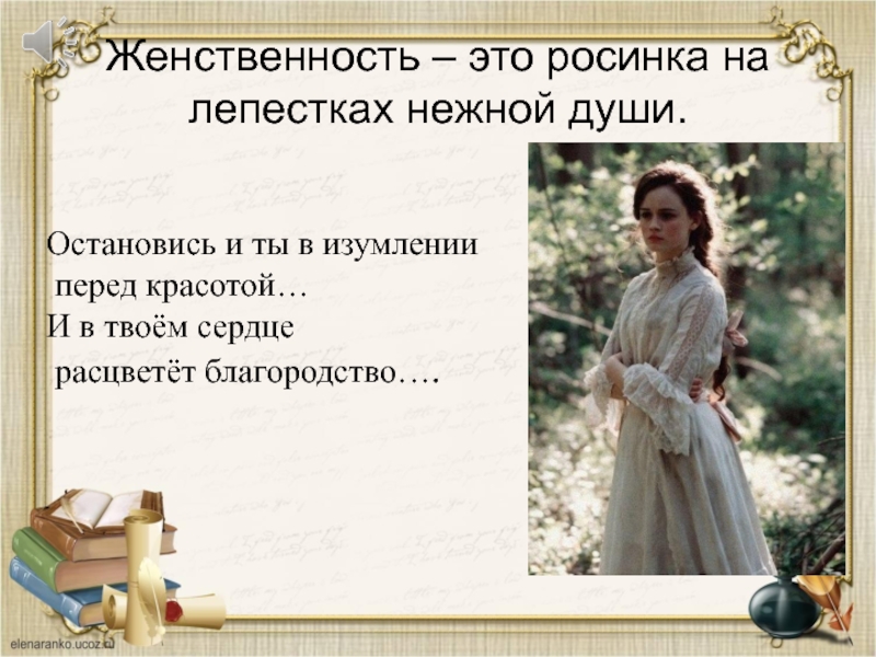 Слайд 12Женственность – это красота, скромность и милосердие, щедро пролитые на