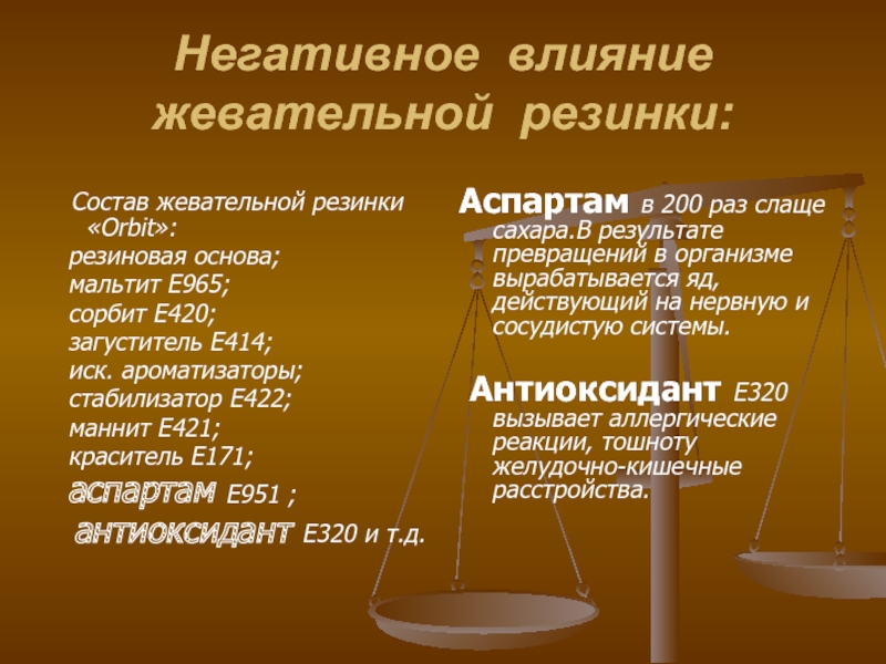 Аспартам в 200 раз слаще сахара.В результате превращений в организме вырабатывается яд, действующий на нервную и сосудистую системы.