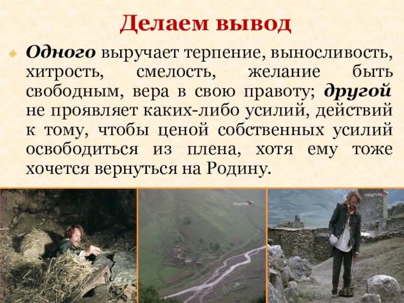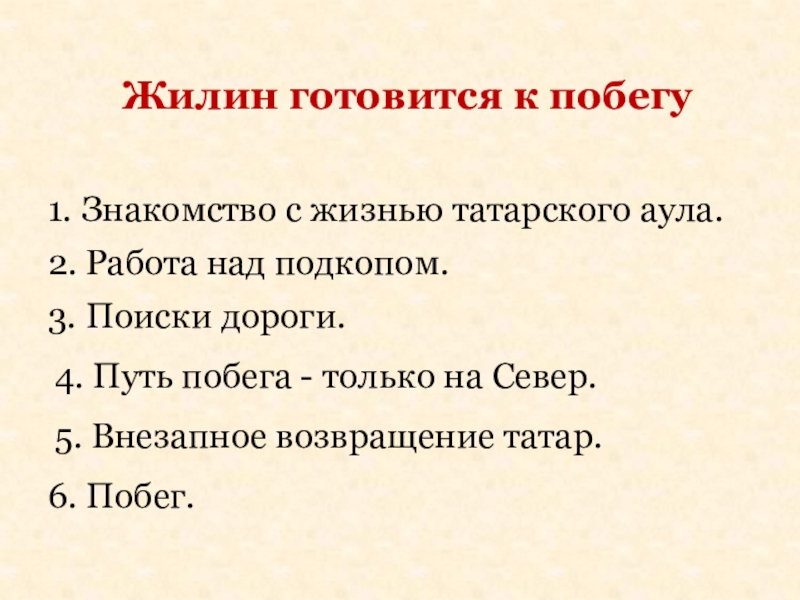 «А сам все высматривает, выпытывает, как ему бежать. Ходит по аулу, насвистывает, а то сидит, что-нибудь рукодельничает — или из глины кукол лепит, или плетет плетенки из прутьев. А Жилин на всякое рукоделье был мастер»