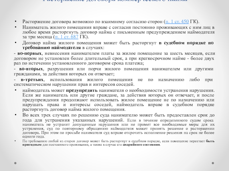 По требованию любой из сторон договор может быть расторгнут в судебном порядке, если помещение перестает быть пригодным для постоянного проживания, а также в случае его аварийного состояния.