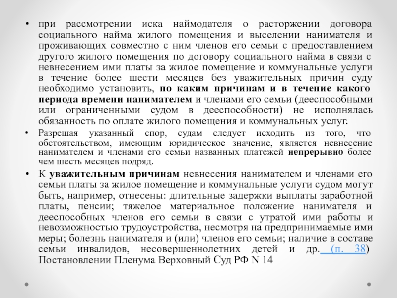 К уважительным причинам невнесения нанимателем и членами его семьи платы за жилое помещение и коммунальные услуги судом могут быть, например, отнесены: длительные задержки выплаты заработной платы, пенсии; тяжелое материальное положение нанимателя и дееспособных членов его семьи в связи с утратой ими работы и невозможностью трудоустройства, несмотря на предпринимаемые ими меры; болезнь нанимателя и (или) членов его семьи; наличие в составе семьи инвалидов, несовершеннолетних детей и др. (п. 38) Постановлении Пленума Верховный Суд РФ N 14