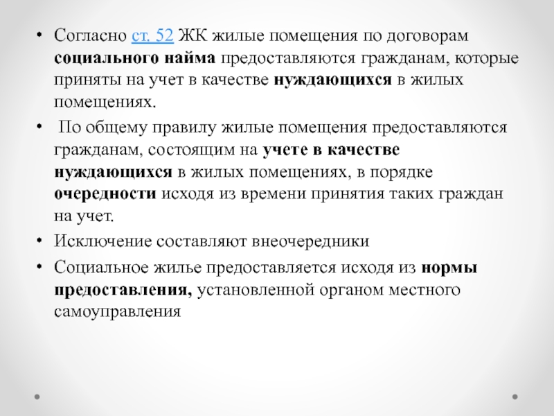 Слайд 13Согласно ст. 52 ЖК жилые помещения по договорам социального найма