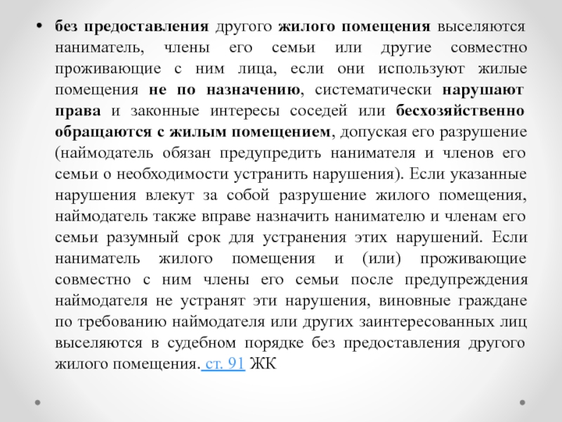 жилые помещения не по назначению, систематически нарушают права и законные интересы соседей или бесхозяйственно обращаются с жилым помещением, допуская его разрушение (наймодатель обязан предупредить нанимателя и членов его семьи о необходимости устранить нарушения). Если указанные нарушения влекут за собой разрушение жилого помещения, наймодатель также вправе назначить нанимателю и членам его семьи разумный срок для устранения этих нарушений. Если наниматель жилого помещения и (или) проживающие совместно с ним члены его семьи после предупреждения наймодателя не устранят эти нарушения, виновные граждане по требованию наймодателя или других заинтересованных лиц выселяются в судебном порядке без предоставления другого жилого помещения. ст. 91 ЖК