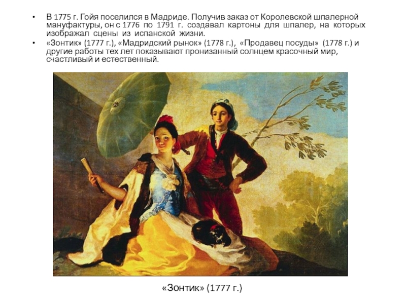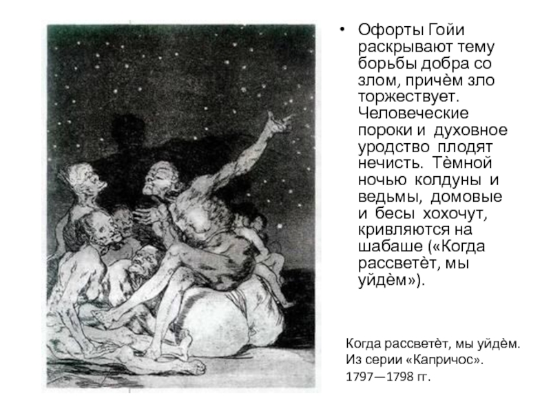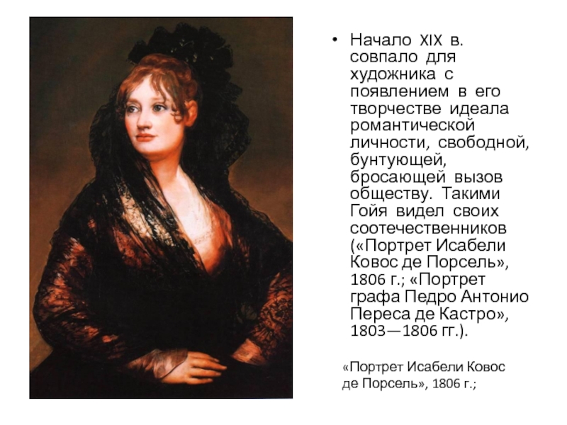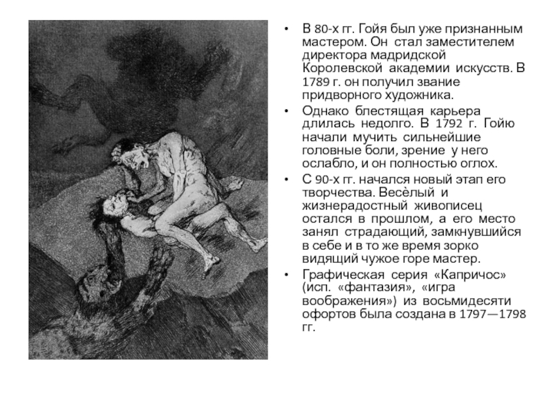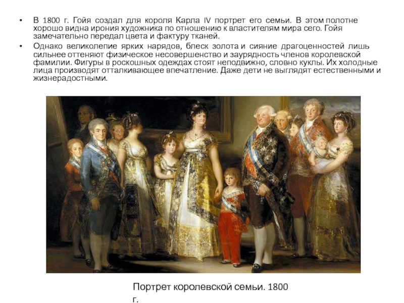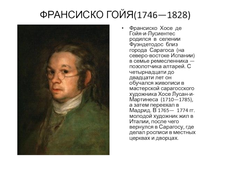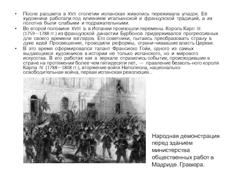 В это время сформировался талант Франсиско Гойи, одного из самых выдающихся художников в истории не только испанского, но и мирового искусства. В его работах как в зеркале отразились события, происходившие в стране на протяжении более чем пятидесяти лет, — правление безволь-ного короля Карла IV (1788—1808 гг.), вторжение войск Наполеона, национально-освободительная война, первая испанская революция...