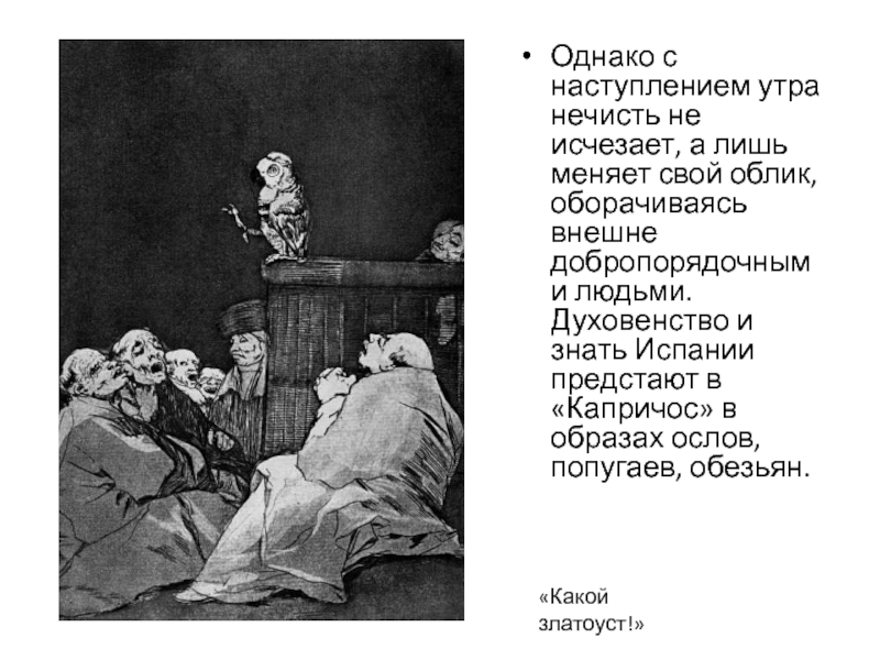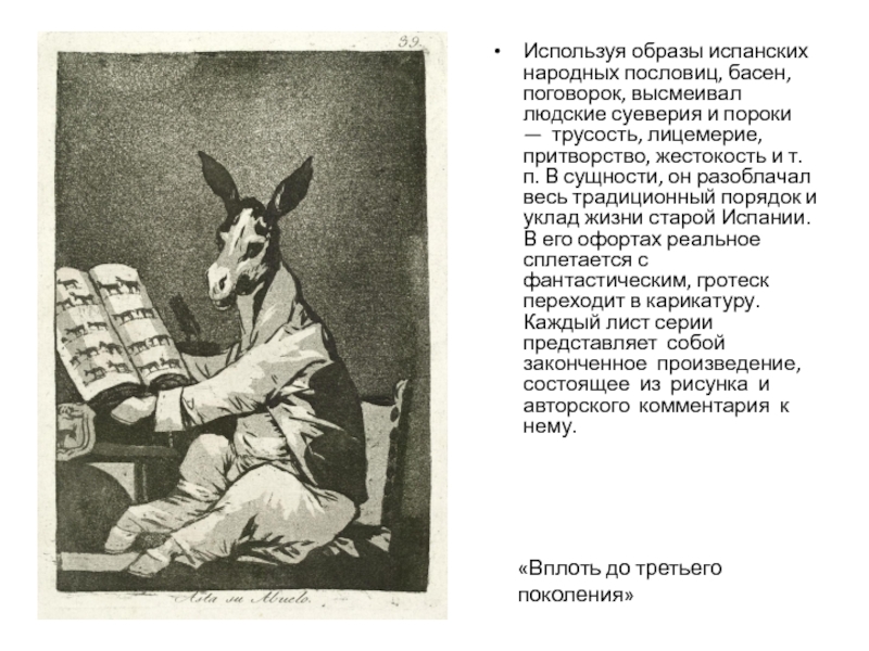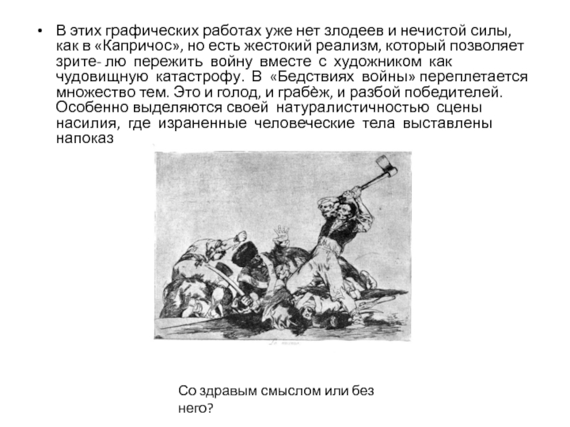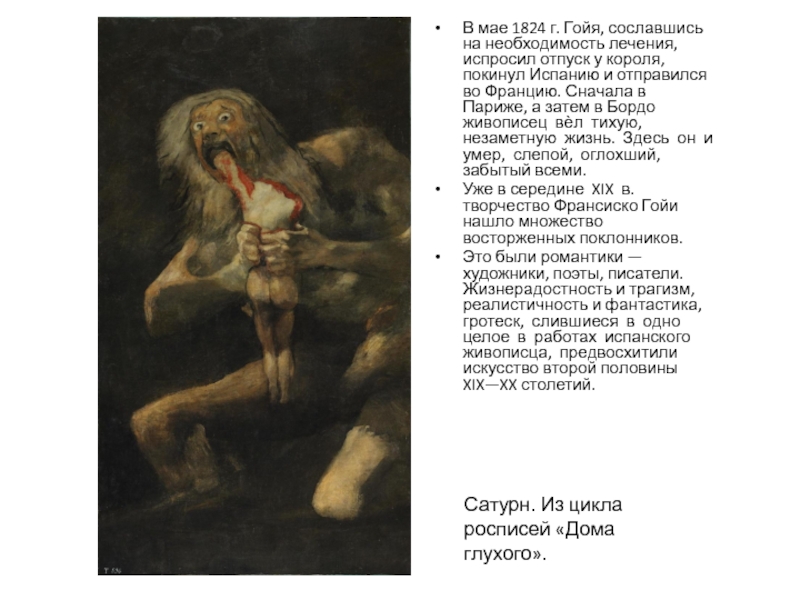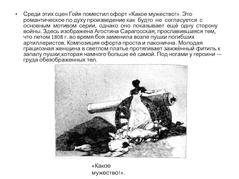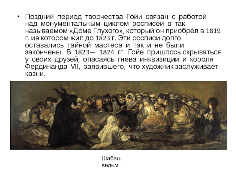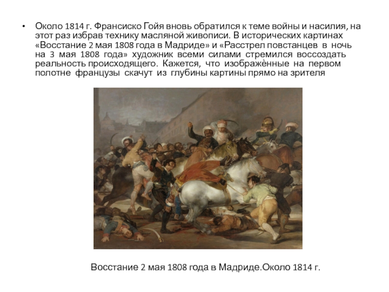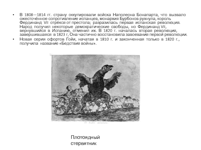 В это время сформировался талант Франсиско Гойи, одного из самых выдающихся художников в истории не только испанского, но и мирового искусства. В его работах как в зеркале отразились события, происходившие в стране на протяжении более чем пятидесяти лет, — правление безволь-ного короля Карла IV (1788—1808 гг.), вторжение войск Наполеона, национально-освободительная война, первая испанская революция...