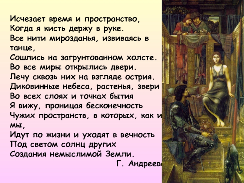 Слайд 13Исчезает время и пространство, Когда я кисть держу в руке. Все нити