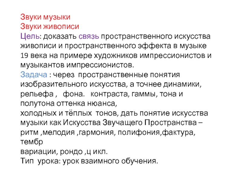 холодных и тёплых тонов, дать понятие искусства музыки как Искусства Звучащего Пространства –ритм ,мелодия ,гармония, полифония,фактура,тембр