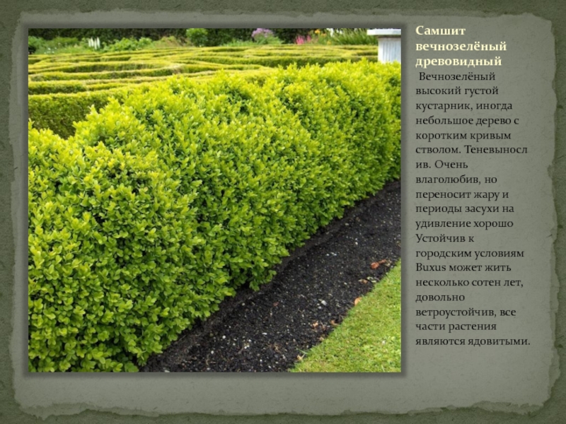 на удивление хорошо Устойчив к городским условиям Buxus может жить несколько сотен лет, довольно ветроустойчив, все части растения являются ядовитыми.