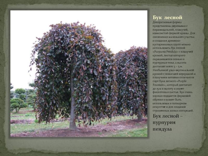 бук лесной «Purpurea Pendula» с плакучей кроной, листья которого окрашиваются осенью в пурпурные тона, а высота достигает всего 3 – 5 м. Необычной узко-вертикальной кроной с повисшей верхушкой и плакучими ветвями отличается сорт бука лесного «Purple Fountain», который достигает до 15 м в высоту и имеет фиолетовые листья. Бук очень хорошо поддается формовой обрезке и может быть использован в топиарном искусстве и для создания стриженных живых изгородей. Бук лесной – пурпурия пендула