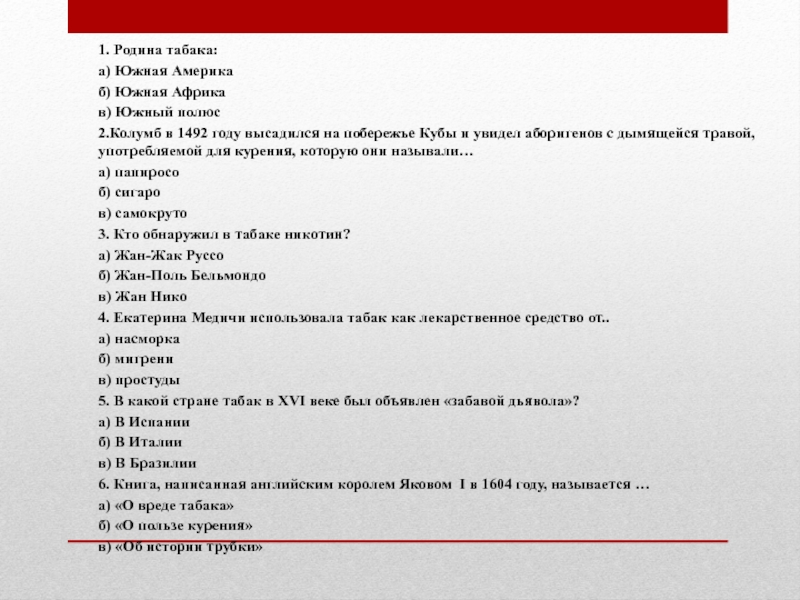1. Родина табака:а) Южная Америкаб) Южная Африкав) Южный полюс	2.Колумб в 1492 году высадился на побережье Кубы и увидел