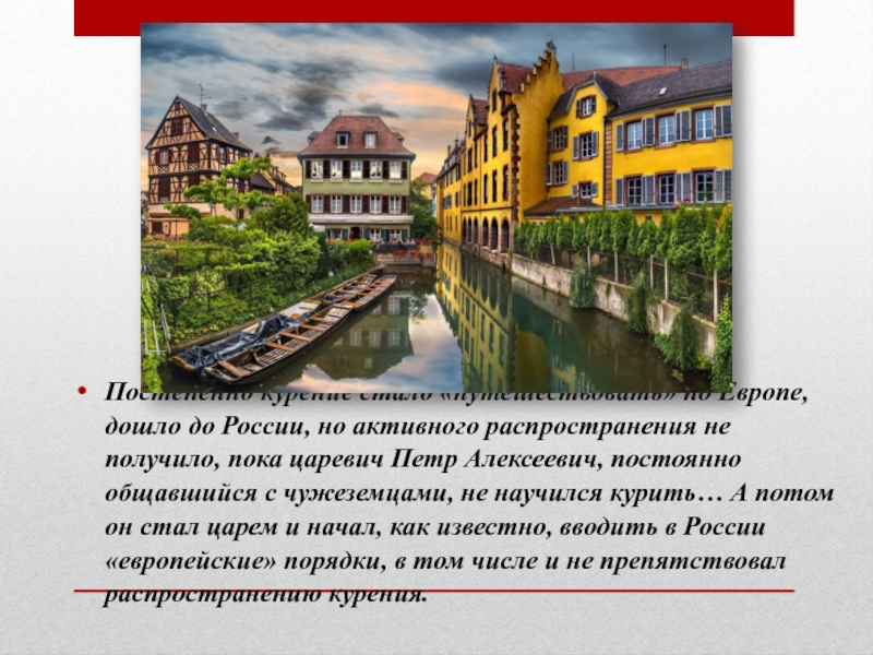 Слайд 8Постепенно курение стало «путешествовать» по Европе, дошло до России, но