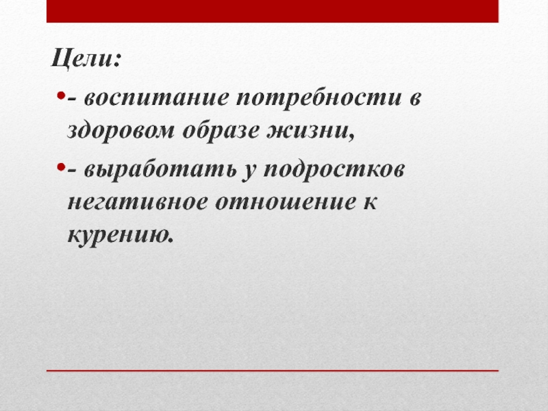 Цели:- воспитание потребности в здоровом образе жизни,- выработать у подростков негативное отношение к курению.