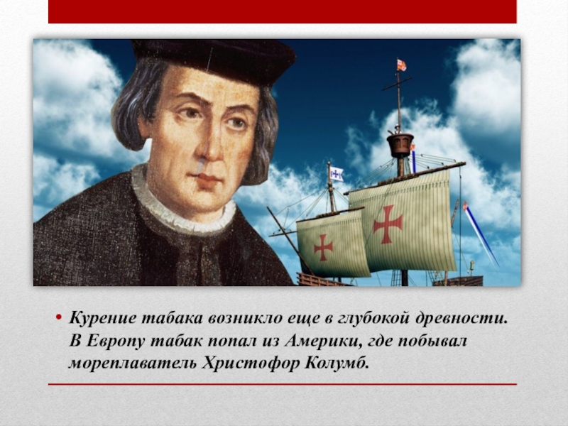 Курение табака возникло еще в глубокой древности. В Европу табак попал из Америки, где побывал мореплаватель Христофор