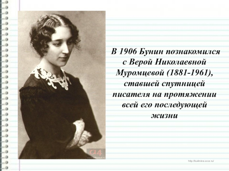 Слайд 8В 1906 Бунин познакомился с Верой Николаевной Муромцевой (1881-1961), ставшей